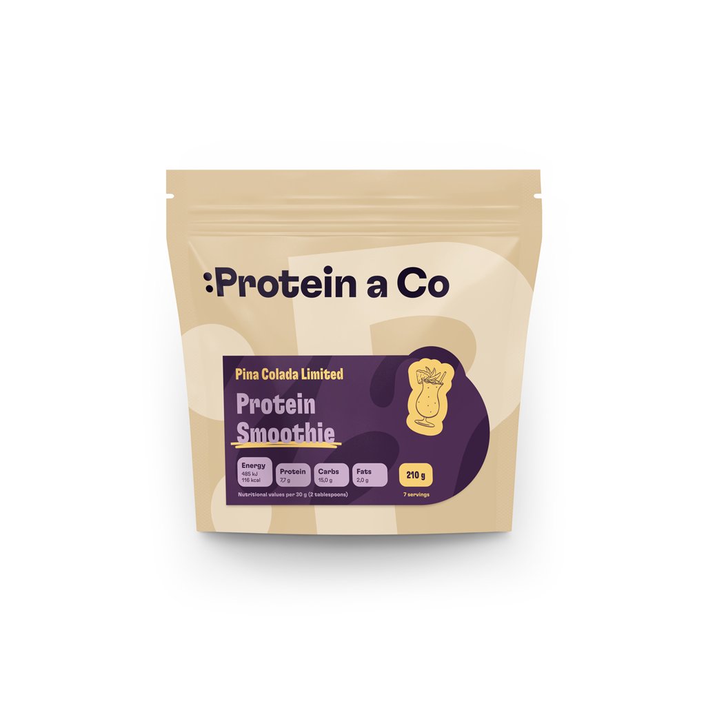 Piña Colada: ananas liofilizowany (proszek) 50%, koncentrat białka serwatkowego (emulgator: lecytyna słonecznikowa) min. 21%, pełne mleko w proszku, serwatka w proszku, mieszanka błonnika rozpuszczalnego [inulina, guma guar] min. 3%, suszony kokos min. 3%, glicyna, aromat, substancja słodząca: glikozydy stewiolowe