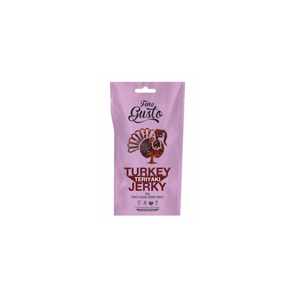 Teriyaki: suszone mięso z indyka 77,4% (na 100 g produktu użyto 166 g surowego mięsa), sól spożywcza, nasiona sezamu, sos sojowy (woda pitna, soja, sól, ocet spirytusowy), sos worcester (woda pitna, ocet spirytusowy, cukier, sól spożywcza, białe wino, powidła śliwkowe, przecier pomidorowy, aromat naturalny), ocet spirytusowy, olej rzepakowy, substancja nawilżająca: glicerol, aromaty naturalne, mieszanka przypraw.
