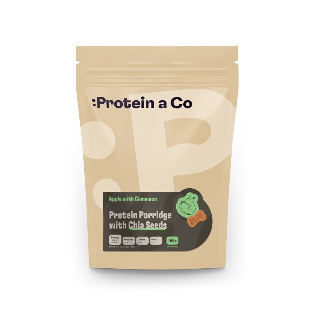 Jabłko z cynamonem: płatki owsiane (min. 40%), koncentrat białka serwatkowego 80% (min. 25%), chia (min. 3%), suszone jabłka (min. 3%), organiczny cukier kokosowy, mleko w proszku, cynamon