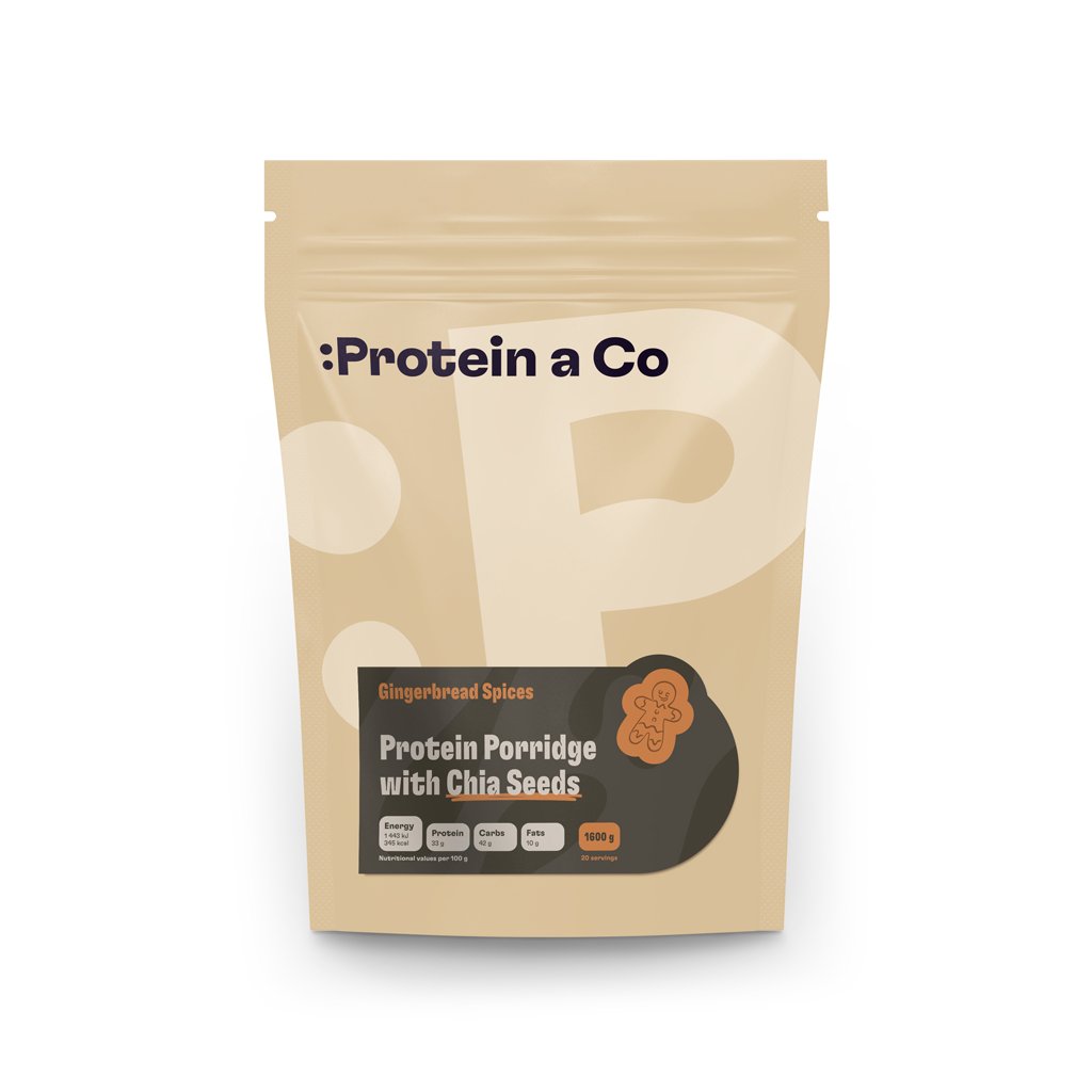 Gingerbread spices: płatki owsiane (min. 40%), koncentrat białka serwatkowego 80% (min. 28%), nasiona chia (min. 5%), organiczny cukier kokosowy, mleko w proszku, przyprawy piernikowe (cynamon, goździki, kolendra, fenkuł włoski, anyż), ziele angielskie, kwiat muszkatołowy, gałka muszkatołowa, anyż gwiaździsty w różnych proporcjach)