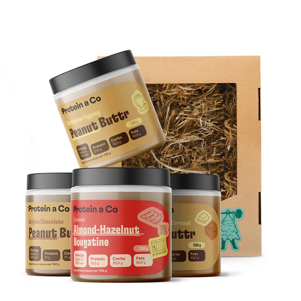Christmas Eggnog - krem z orzeszków ziemnych o smaku ajerkoniaku: Prażone ziarna orzeszków ziemnych (orzeszki ziemne) min. 78%, biała czekolada [cukier, masło kakaowe, pełne mleko w proszku, serwatka w proszku, emulgator: lecytyna sojowa; naturalny aromat wanilii] min. 12%, aromat.